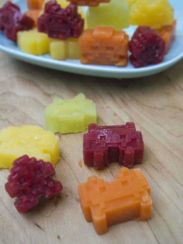 Każdego kosmitę tworzymy w takim sam sposób, czyli obieramy owoce, kroimy, dodajemy przyprawy i blendujemy na papkę. Formę do kostek lodu wypełniamy płynem i zamrażamy.