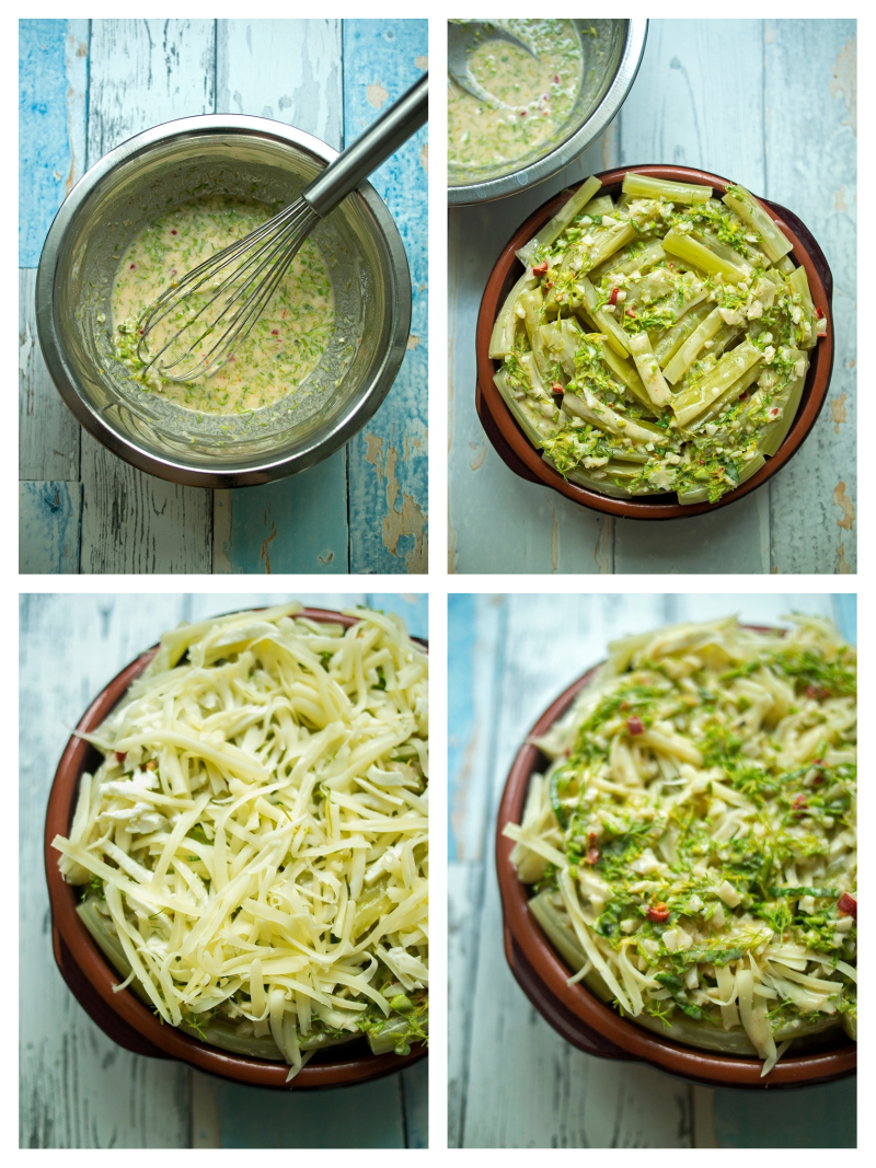 7). Przełóż do naczynia ugotowane łodygi, polej z wierzchu połową płynu, dodaj na wierzch starty ser i przelej resztę płynu.