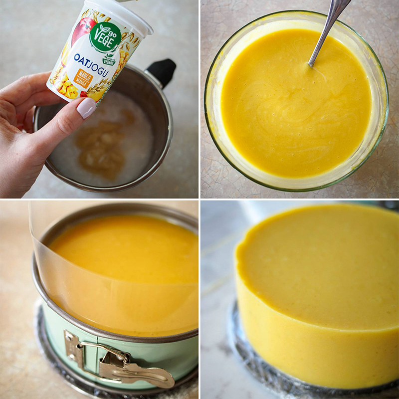 Hint2: oczywiście nic nie stoi na przeszkodzie, aby przygotować „ser” w wersji niewegańskiej. Agar zastępujemy 2 opakowaniami dowolnej galaretki o żółtym kolorze (np mix brzoskwiniowa i cytrynowa – zwróć uwagę aby to były galaretki, które rozpuszcza się w 500 ml wody) lub zwykłą żelatyną. Wówczas obie galaretki lub żelatynę także rozpuszczamy w 150 płynu. Ja wybrałabym żelatynę (ok 4 płaskie łyżki), ponieważ nie stłumi obłędnego smaku mango. Mleko kokosowe można zastąpić świeżo ubitą śmietaną (nie z proszku ani spreju) albo jogurtem greckim. Aczkolwiek mleko kokosowe robi robotę bo ciasto przypomina w smaku mango sticky rice (jak nie znasz wygugluj i spróbuj zrobić – coś pysznego). Zamiast jogurtu kokosowego można wziąć po prostu więcej mleka kokosowego.